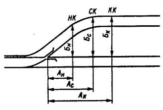 Конец и начало отвода возвышения наружного рельса кривой и кривизны должны совпадать с точками НПК (начало переходной кривой) и КПК (конец переходной кривой).