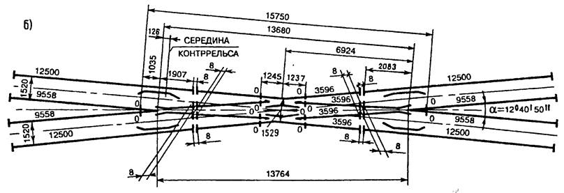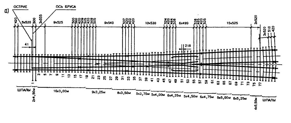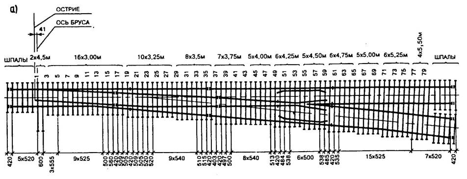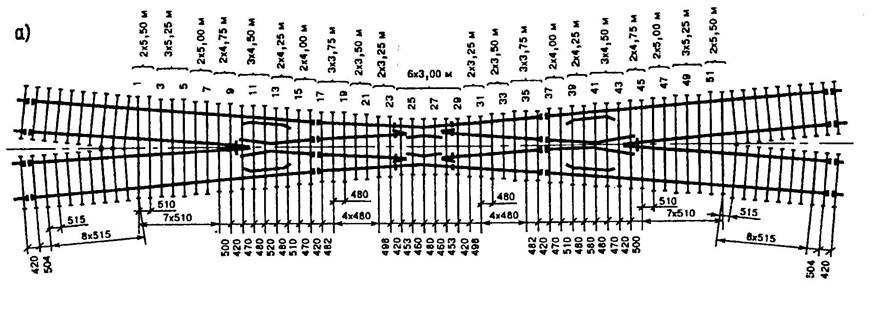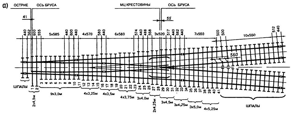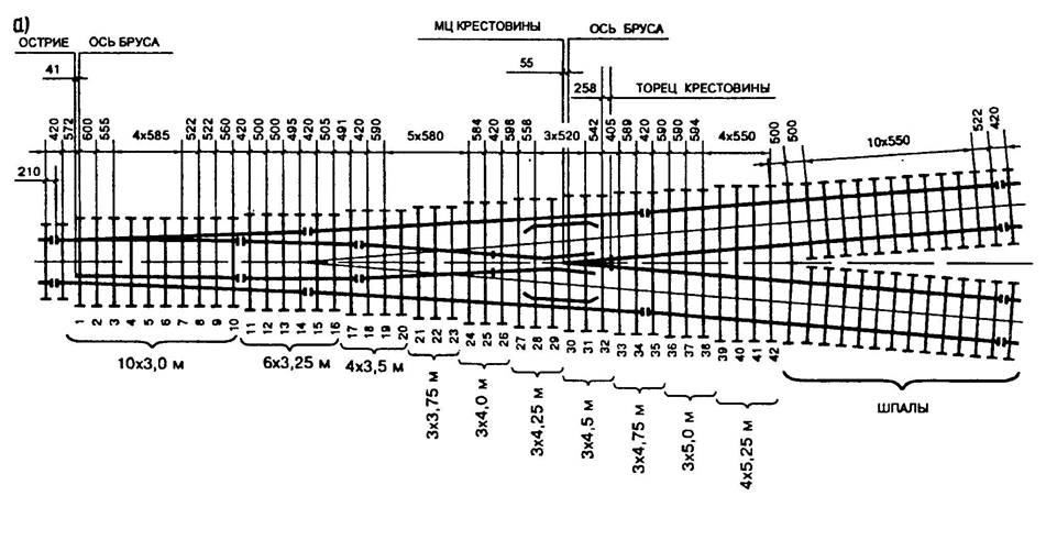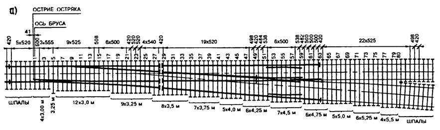 Закрестовинные кривые на путях следования пассажирских и грузовых поездов со скоростью более 25 км/ч должны иметь возвышения наружного рельса. Отвод возвышения должен начинаться за последним переводным брусом, но не ближе 2 м от заднего стыка крестовины. При возможности устройства отвода возвышения с допускаемым уклоном по табл.2.1 делается полное возвышение. Если такой отвод неосуществим, то величина возвышения наружного рельса устанавливается начальником службы пути.
