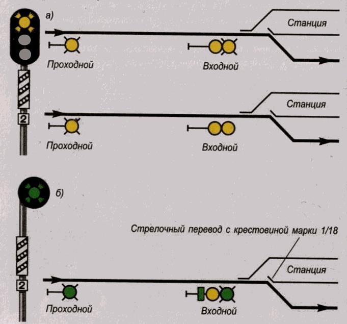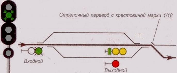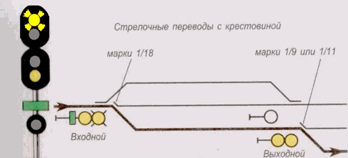 2.5. На входных и маршрутных светофорах при приеме поездов на боковые пути по стрелочным переводам с крестовинами пологих марок применяются сигналы: