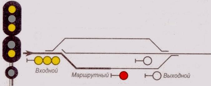 Этот сигнал применяется на входных, а также маршрутных и выходных (кроме групповых) светофорах.