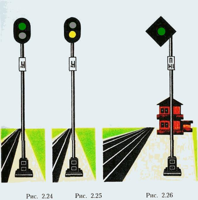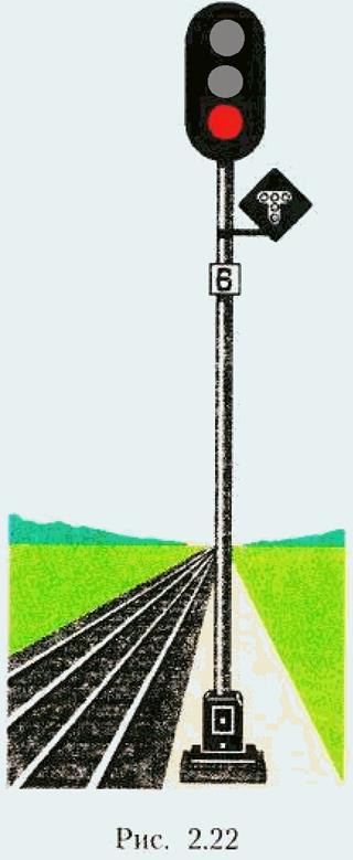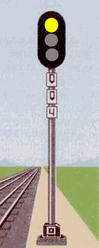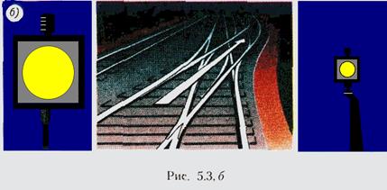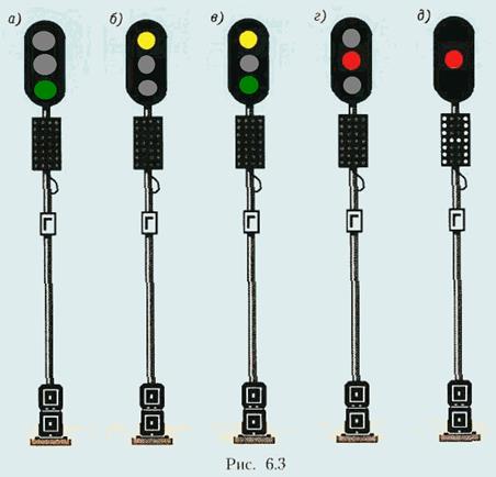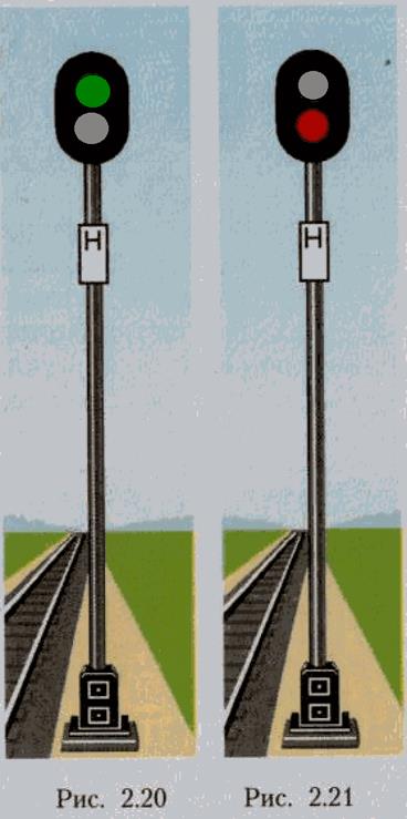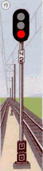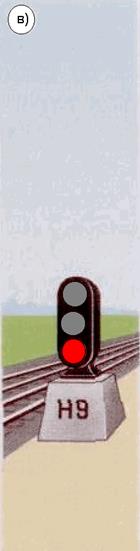 один желтый огонь - "Разрешается поезду следовать на станцию по главному пути с готовностью остановиться; следующий светофор (маршрутный или выходной) закрыт" (рис. 2.2, а);