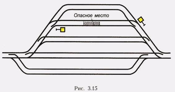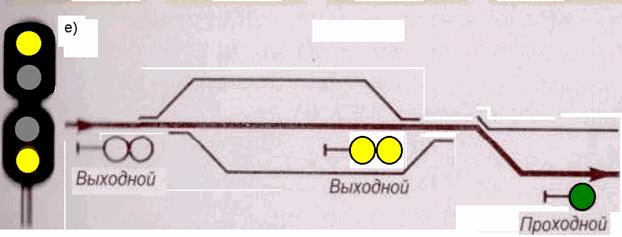 два желтых огня, из них верхний мигающий, - "Разрешается поезду следовать на станцию с уменьшенной скоростью на боковой путь; следующий светофор (маршрутный или выходной) открыт" (рис. 2.2, б);