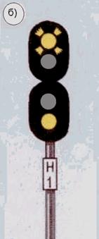 На отдельных станциях в случаях, предусмотренных Правилами технической эксплуатации железных дорог Российской Федерации, на входных и маршрутных светофорах может применяться сигнал три желтых огня - "Разрешается моторвагонному поезду, одиночному локомотиву, мотовозу, дрезине следовать на свободный участок пути с особой осторожностью и со скоростью не более 20 км/ч до маршрутного светофора с красным огнем" (рис. 2.4. б).