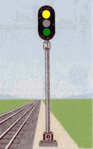 один желтый мигающий огонь - "Разрешается поезду следовать на станцию по главному пути с установленной скоростью; следующий светофор (маршрутный или выходной) открыт и требует проследования его с уменьшенной скоростью" (рис. 2.1, б);