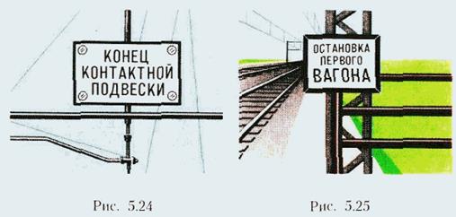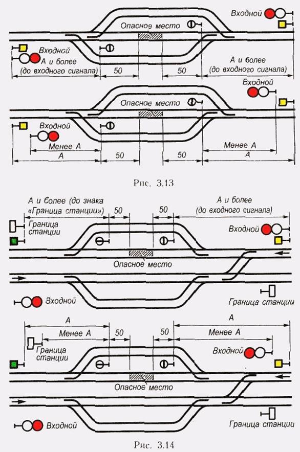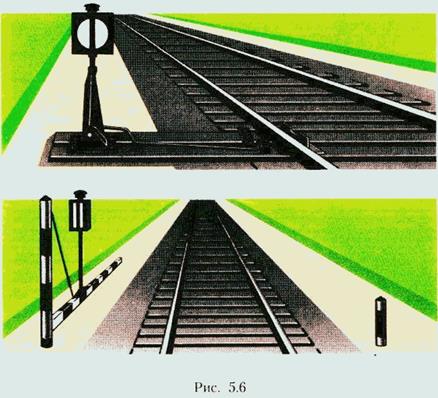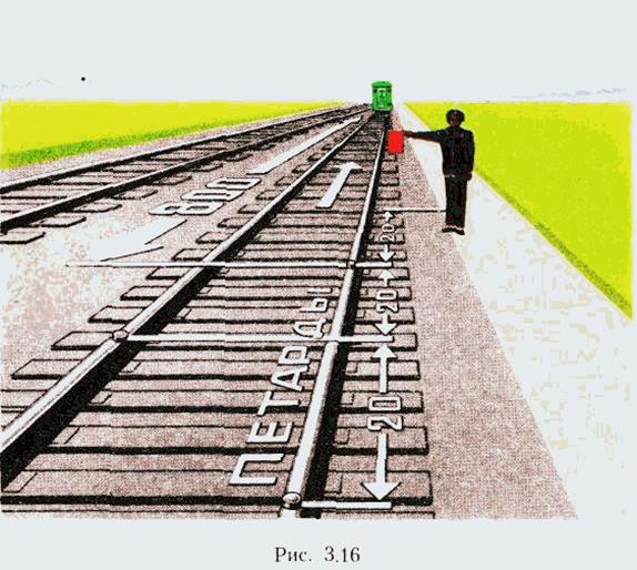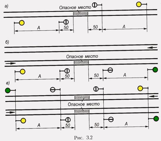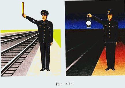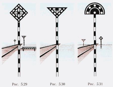 заградительные - требующие остановки при опасности для движения, возникшей на железнодорожных переездах, крупных искусственных сооружениях и обвальных местах, а также при ограждении составов для осмотра и ремонта вагонов на станционных путях;