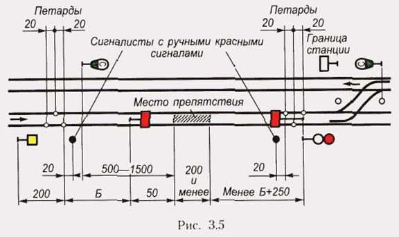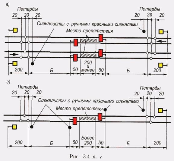 Съемные ремонтные вышки и путевые вагончики на перегоне должны быть, кроме того, ограждены с обеих сторон переносными или ручными красными сигналами, переносимыми одновременно с передвижением ремонтной вышки и вагончика, на расстоянии Б, указанном в графе 4 табл. 3.1, в зависимости от руководящего спуска и максимальной допускаемой скорости на перегоне.