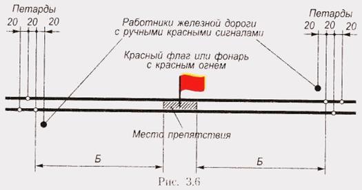 путевой вагончик: днем - щит, окрашенный с обеих сторон в красный цвет, или красный флаг на шесте; ночью - спереди и сзади красный огонь фонаря, укрепленного на шесте.
