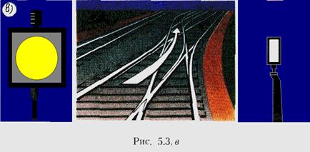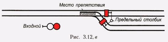 два желтых огня - "Разрешается поезду следовать на станцию с уменьшенной скоростью на боковой путь и готовностью остановиться; следующий светофор закрыт" (рис. 2.2, в);