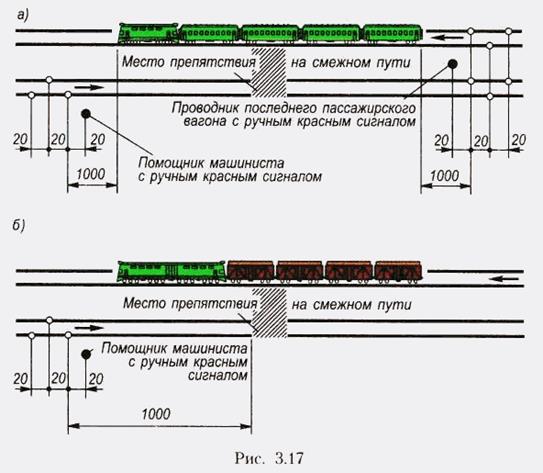 Если на двухпутном или многопутном участке по смежному пути будет следовать встречный поезд, то красный сигнал, ограждающий съемную ремонтную вышку, путевой вагончик или другую съемную подвижную единицу с передней стороны, до прохода поезда снимается.
