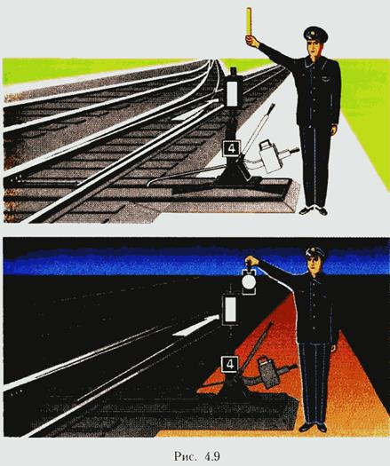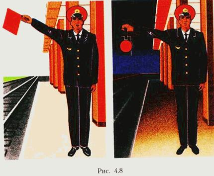 дневные, подаваемые в светлое время суток; для подачи таких сигналов служат диски, щиты, флаги и сигнальные указатели (стрелочные, путевого заграждения, устройств сбрасывания и гидравлических колонок);