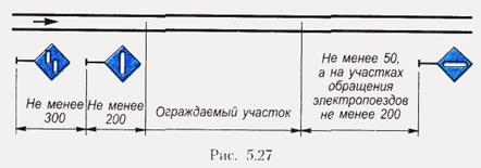При движении по станционным путям и стрелочным переводам съемная ремонтная вышка и путевой вагончик, кроме того, должны быть ограждены на расстоянии не менее 50 м с обеих сторон переносными или ручными красными сигналами, переносимыми одновременно с передвижением съемной ремонтной вышки и путевого вагончика.