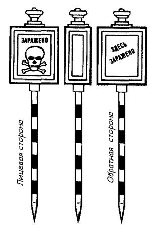 9.7. Для предупреждения локомотивных бригад и других работников, обслуживающих поезд, о следовании поезда на зараженный участок, а также для предотвращения входа людей на него без индивидуальных средств защиты (противогазов, защитных костюмов и др.) такой участок ограждается специальными указателями "Заражено" (рис. 9.1).